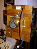 Une autre très rare caméra a été construite par Lucien Prévost avant 1910. Elle ne ressemble guère au modèle utilisé par Buster Keaton: en effet, ce n'est pas une 35mm classique, mais une 70mm ,format parfaitement révolutionnaire pour l'époque. Au catalogue 1910, un modèle sosie en 35mm figure en bonne place sous l'appellation de 1er modèle. Equipées à l'origine d'optiques Carl Zeiss de Iéna en Prusse, les caméras Prévost pouvaient utiliser plusieurs types d'objectifs, du grand angle au téléobjectif. Celle-ci, également visible au Musée Photo de Graçay, est équipée d'un objectif double anastigmat Rudolf de Iéna. C'était une garantie de qualité pour les riches clients de l'époque.